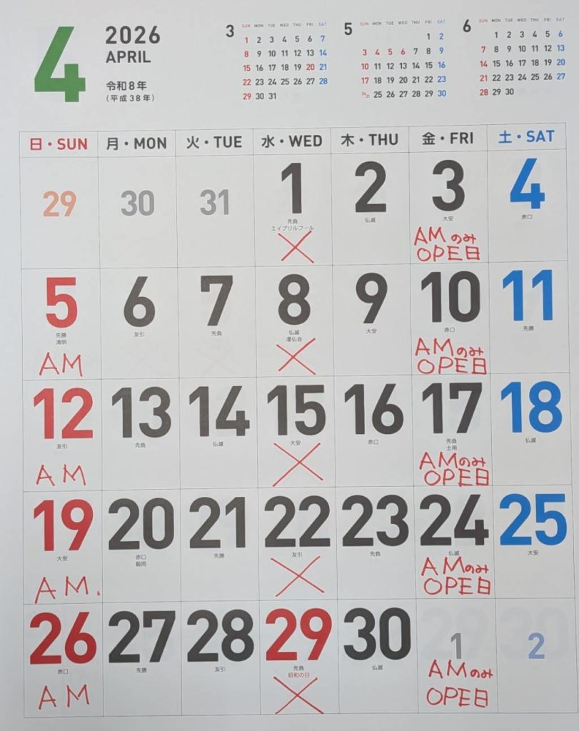 遅くなりましたが、4月休診日のお知らせです!