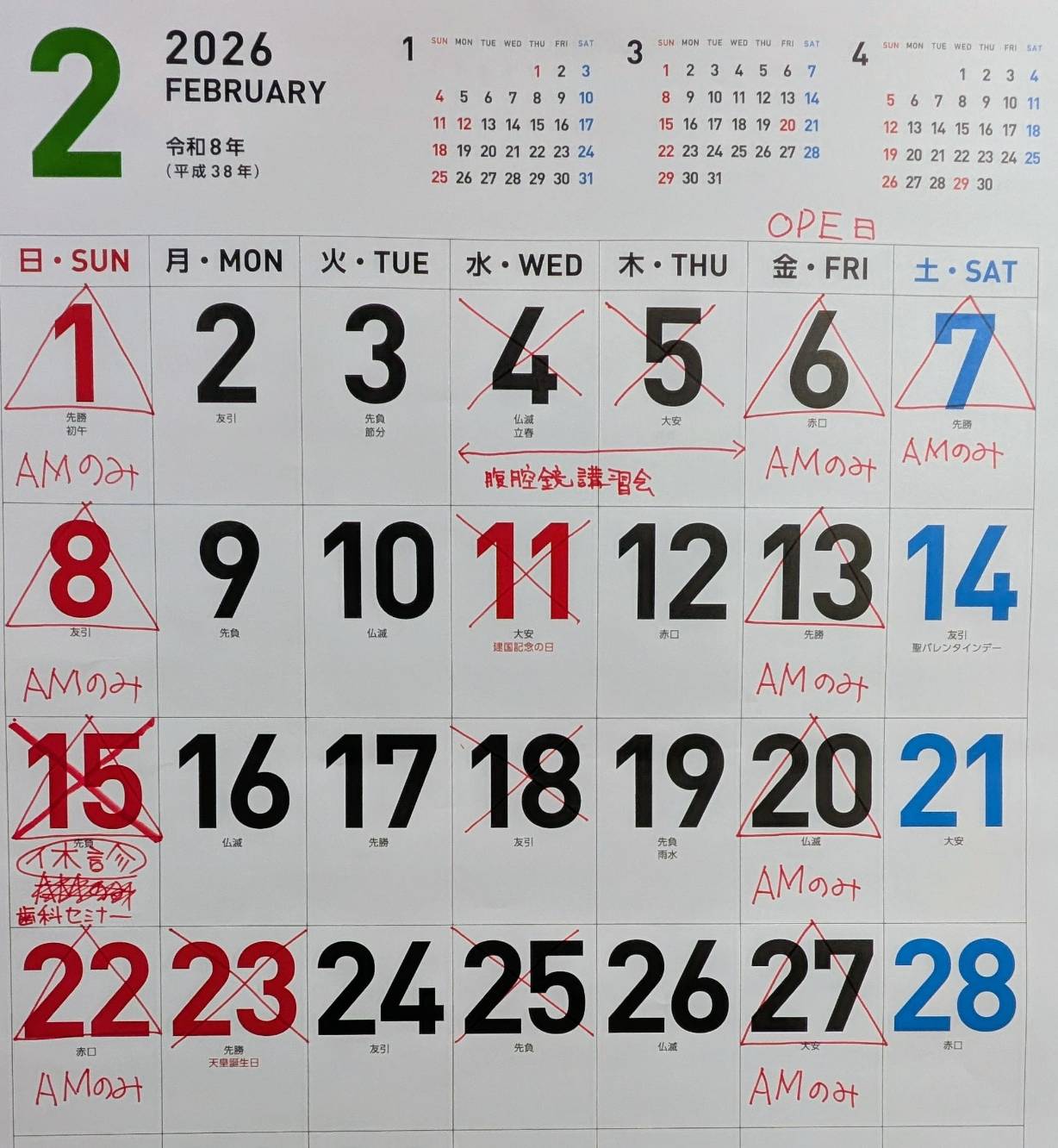 カテゴリー 飼い主さんへ 2月休診日のお知らせ☆ 投稿者 作成者: どうぶつびょういんつむら 投稿日 2026年1月30日 2月の休診日のお知らせです☆ 2月は水曜日・祝日・日曜金曜午後に加えて、5日木曜日と15日日曜日が休診となります。 15日は完全休診となりますので、フードや薬のお渡しも出来ません。 休診日が多く、ご不便ご迷惑をおかけしますが、よろしくお願いいたしますm(_ _)m ご来院の際には休診日をご確認いただきますよう重ねてよろしくお願いいたします。 グリ「休診日が多くてごめんね。雪も降るから気をつけてね〜!ペットドックも特別価格でやってるよ!こちらもよろしくね〜!」